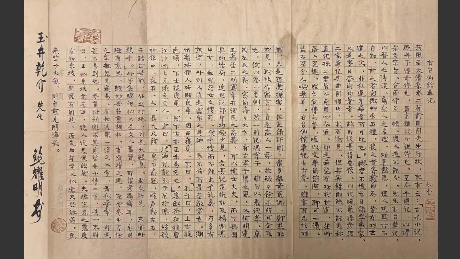 周作人が1940年に発表した「右台仙館筆記」の原稿。発表後の日中の文化交流の様子も示す。 -