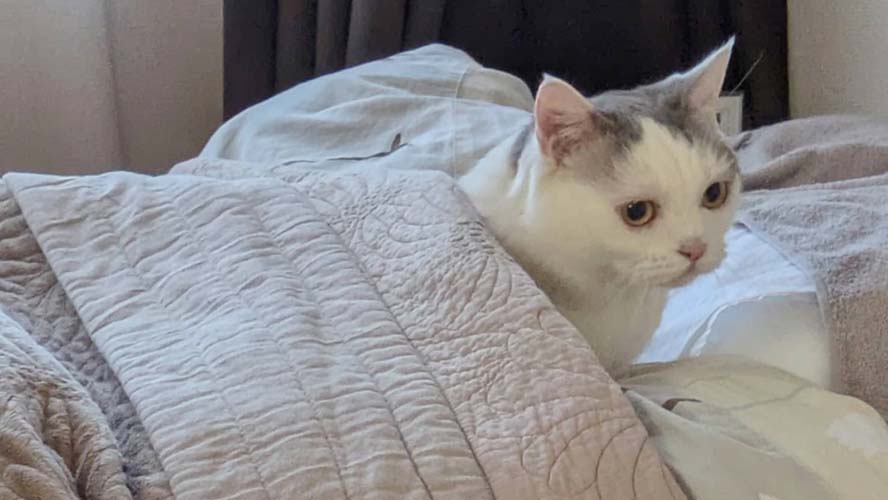 ベッドの中に潜って、飽きて出てきた。やっぱりベッドは上に乗っかるのがいいね。 -
