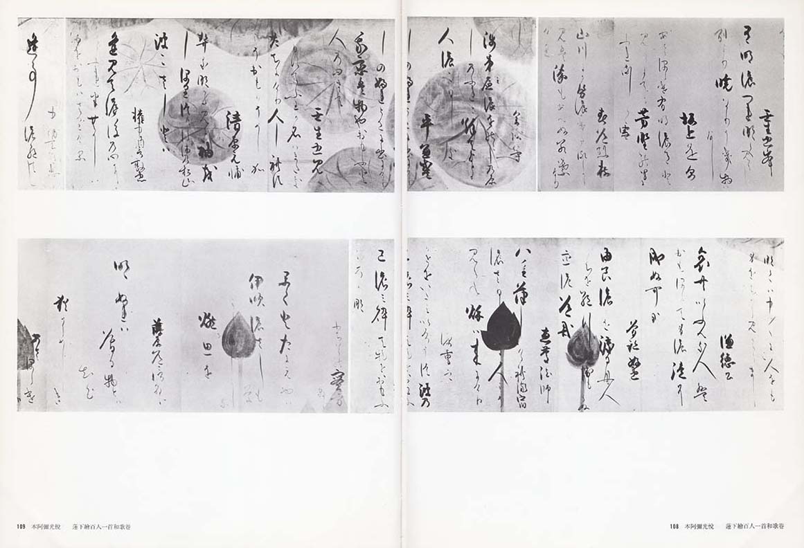 これら再発見の断簡と複製本の57首とを合せると、なんと90首にのぼる筆跡を見ることができるわけである。未発見のものは21、33、34、38、49、50、76、77、78、88の計10首のみである。私は、筆跡を確認しうるすべてをここに並べてみることで「蓮下絵和歌巻」100首中90首の復元を試み、この和歌巻の書の魅力を解明しようと思うのである。