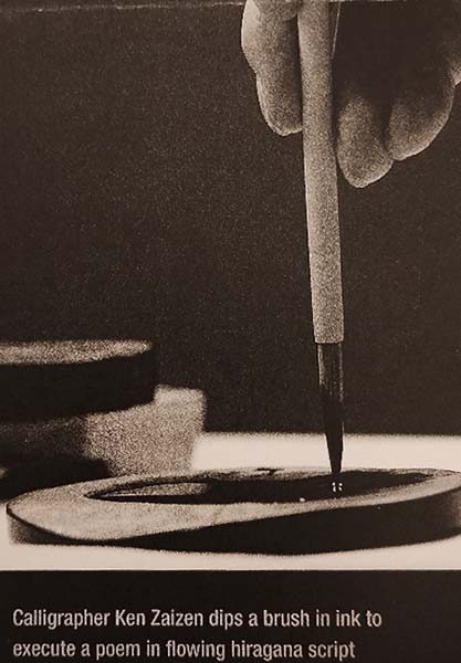 ところが送られてきたJALグループ機内誌『SKYWARD』2009年9月号に載っていたのは、墨を磨っている指先の写真と、筆を持っている写真のみで、鶴の料紙に鶴を詠んだ和歌の書かれた作品はどこにも見当たりません。国際線なので、日本語の和歌というのは読者を想定すると、厳しいものがあったのでしょうか。