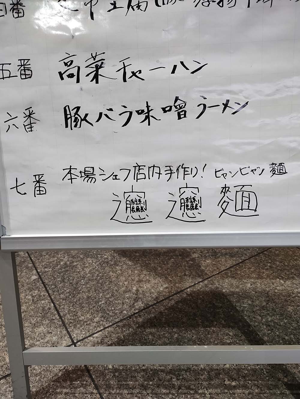 複雑な〈ビャンビャン〉に対し、〈麵〉は省略して〈面〉で表記した看板。