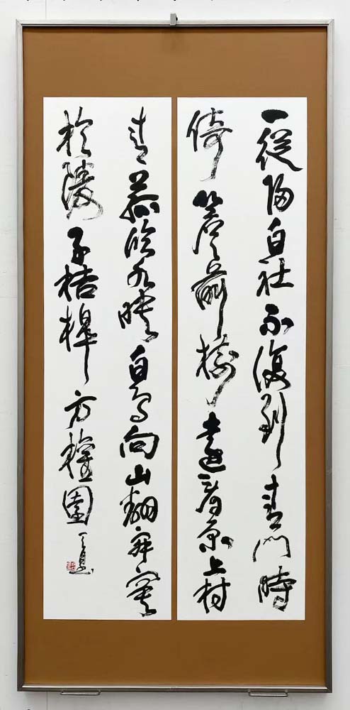 墨の潤渇と微妙な文字バランスの均衡で観る者を惹きつける作。落款印の布置が見事。