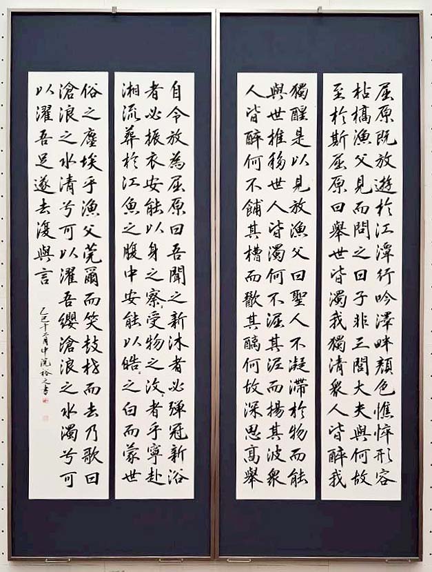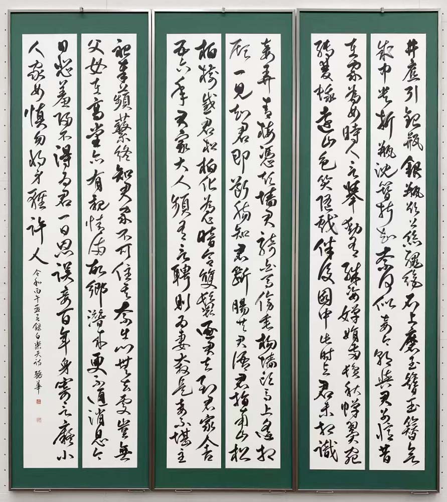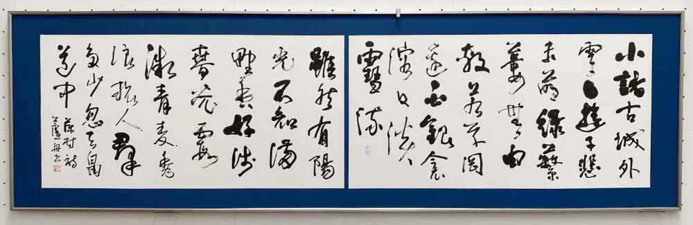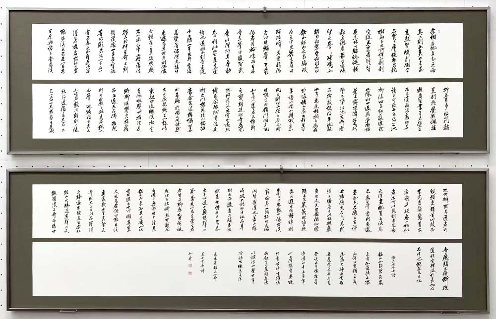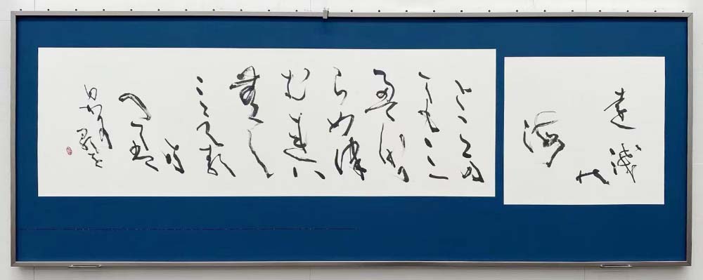 囬瀾書道会は、昨年(2025)6月、有楽町朝日ギャラリーにて、企画展「明日へ向かって」と題して青陵賞作家展・次世代作家展を併催。今回展では、その流れを受けて、次世代作家(17名)のうち選抜作家5名(浅野荷香・池田孝一・栗本眞崙・判澤秀年・𠮷田万由美)が、大作主義の囬瀾書道会にふさわしい作品をと、東京都美術館の壁面を活かした大作に挑戦した。