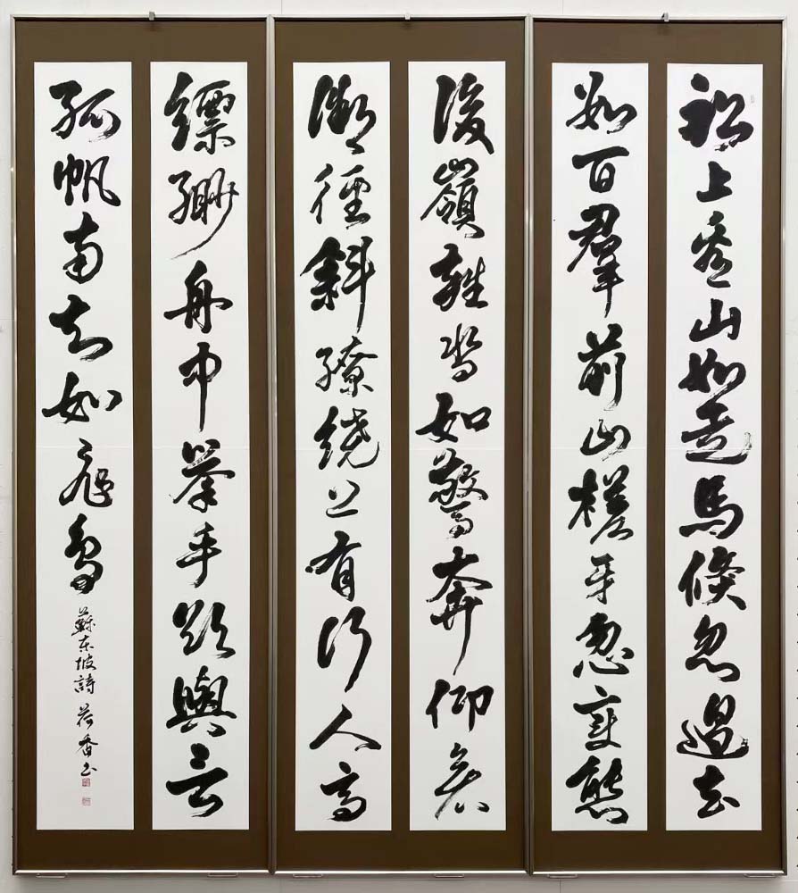 錬度の高い運筆で、王維の詩を情感豊かに書いている。リズムがある書きぶりだが筆が浮くことなく文字に良い重心もある。ただ、3面中2面目の3行目下「飛花」はやや上滑りした感がある。今後は時代が下った傅山などの明清調も視野に入れると良いのではないだろうか。
