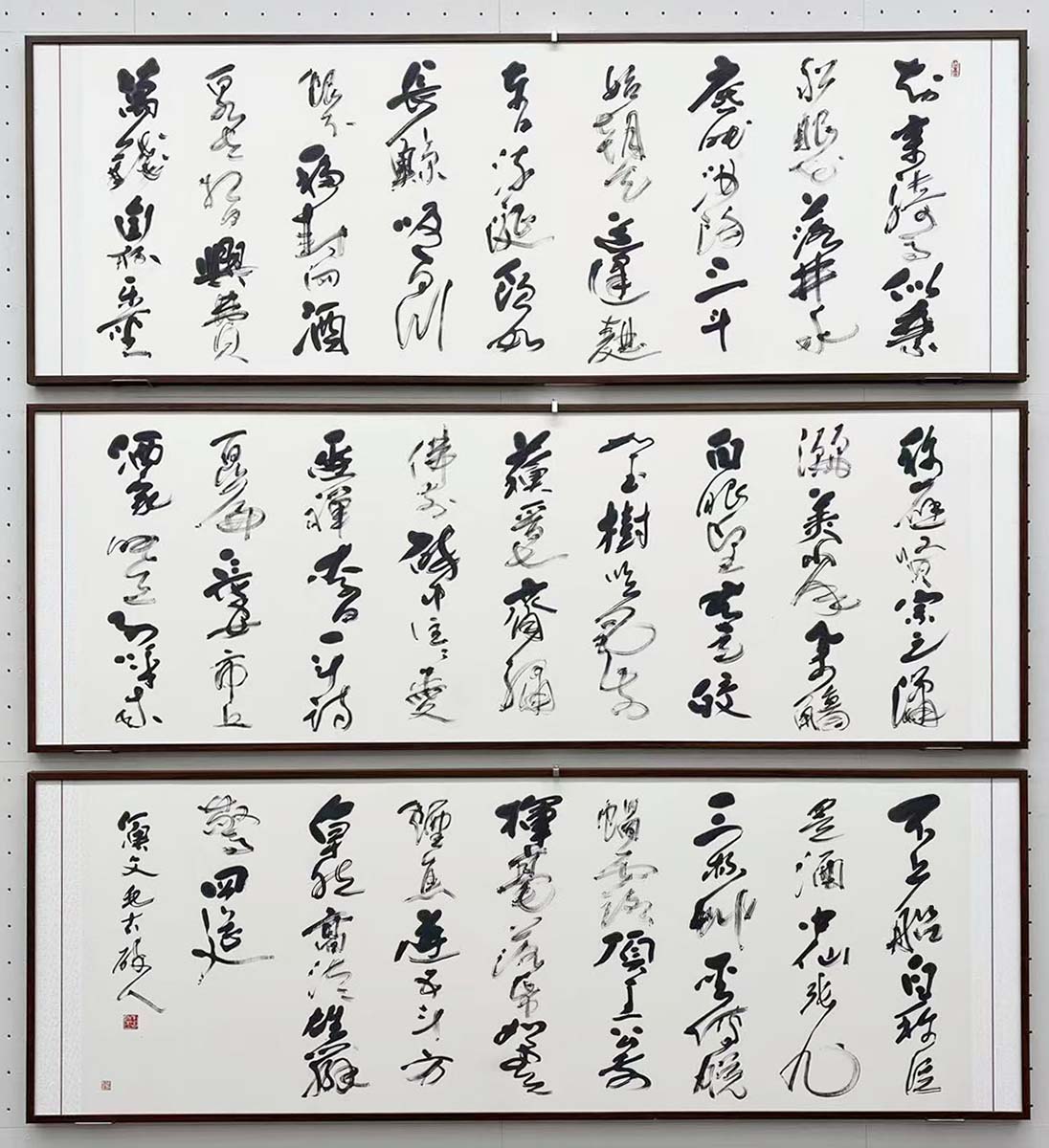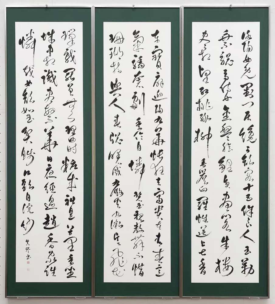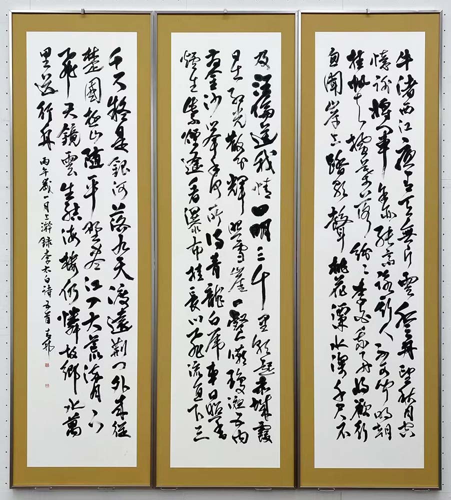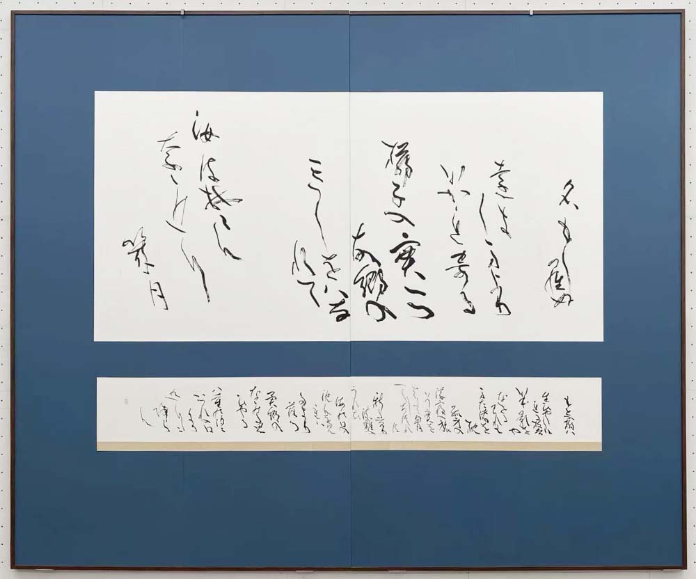 明度のあるすっきりとした線質で、明るい印象の作品である。薄暗い家の床の間で書を愛でていた時代と異なり、明るい照明の展覧会場ではこうした明るさのある作品が好まれる傾向にある。3面に分かれての展示だが、ともに1行目の書き込みに対し、3行目のやや間延びした字配りが気になった。草稿の段階での練り込みに期待したい。
