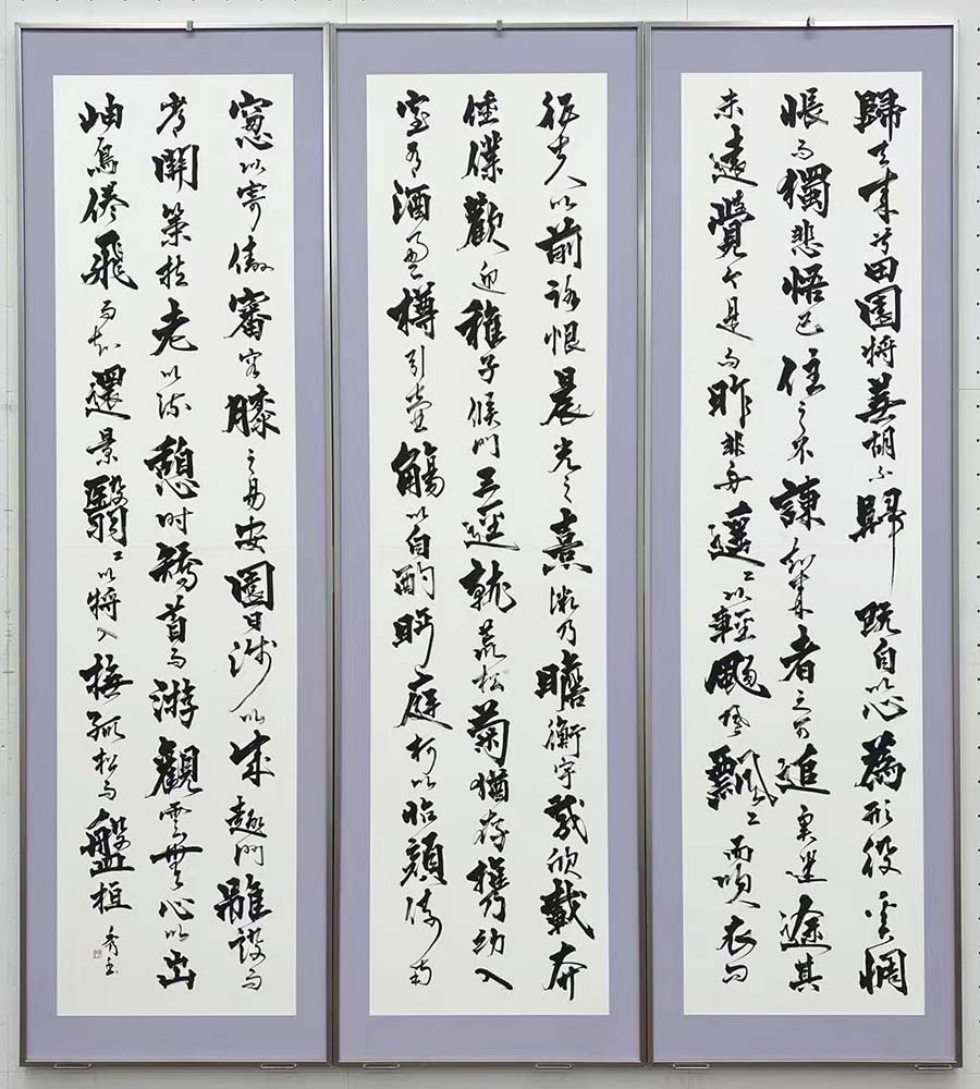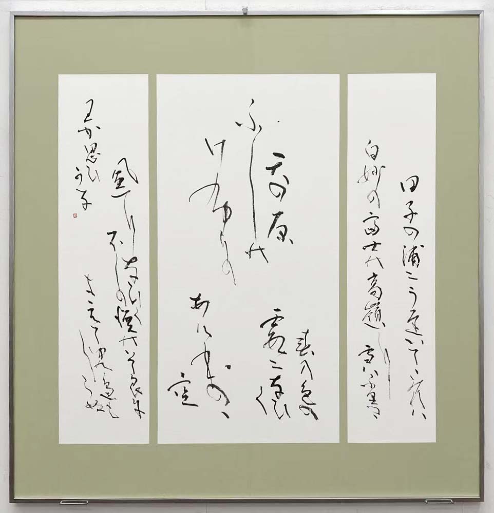 よく練られた線質で、観ていて安定感を感じる作である。ただ気になったのは3面目の体裁だけ3行構成になったことである。サイズの規定もあるだろうが、あえて意図したものであればその意が知りたいと感じた。水墨画にも言えるが、東洋美術は書き込まない部分(白の部分)に意味を見出すことがある。構成が変わり、リズムの変化が気になってしまった。
