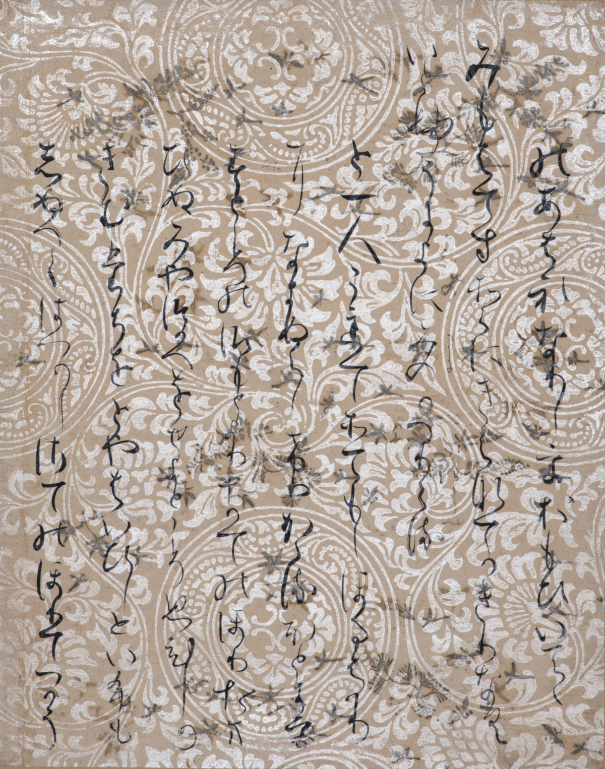 ここに掲載したのは、松﨑コレクションの「石山切伊勢集」のうち、益田鈍翁が記した箱書きがあるもの。「石山切」というと、山河を彷彿とさせる破り継ぎ料紙がすぐに思い浮かぶが、この部分は大らかな唐草に丸紋の唐紙。鳥の子のような濁りのある具引き紙に、厚い雲母で紋様を摺りだしている。中国から舶載された唐紙が人気を博し、12世紀になるとこうした和製のものが作られるようになった。ここに銀泥で折枝や千鳥などが配されている。「関戸本古今集」の流れを汲むクラシックな表現で、一文字一文字にきちんとした骨格がある。