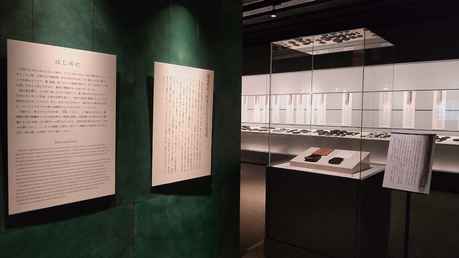 展示のはじまりは、硯の歴史や日本の絵画に登場する硯を紹介し、日本文化に長く寄り添ってきた様子を伝える。飛鳥時代には陶硯(とうけん)の国内製造が行われ、それが次第に石製の硯が主流になっていったという。