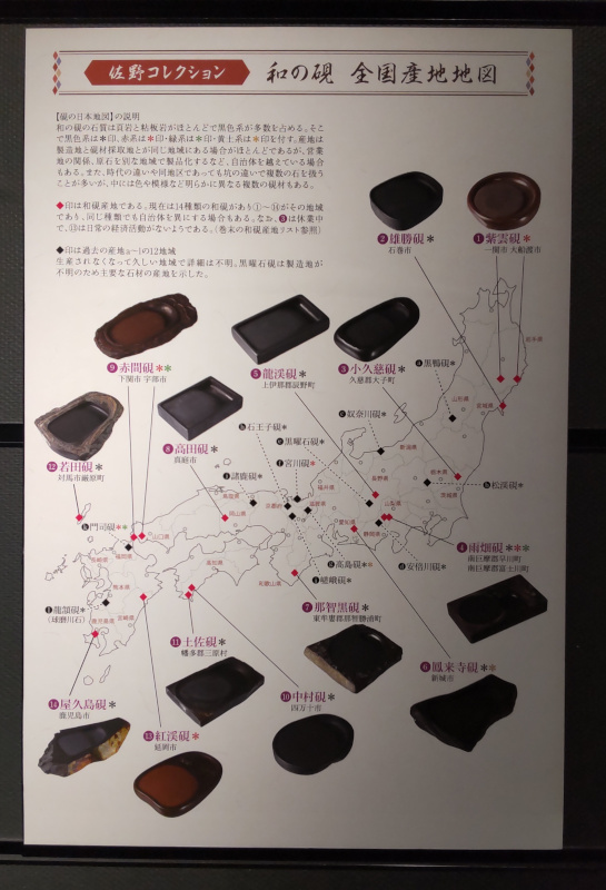 今展に並ぶ生産地は、岩手、宮城、山形、茨城、栃木、山梨、長野、新潟、静岡、愛知、福井、滋賀、京都、和歌山、岡山、鳥取、山口、高知、福岡、長崎、熊本、宮崎、鹿児島と23府県にわたる。山梨県の雨畑硯や、東日本大震災で被害に見舞われた雄勝硯(おがつすずり)などが有名であるが、各地でこれほど硯がつくられているとは知らなかった。