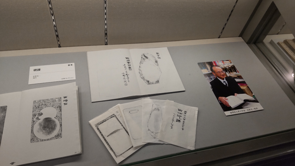展示の最後には集めた硯の硯譜が展示されていた。題字などの佐野教授の筆跡を見ると懐かしい気持ちで胸がいっぱいになる。佐野教授は授業やオープンカレッジで用いるプリント類や字典を自ら切り貼りしてつくり、題箋などもそのつど書いていた。生徒にも半紙の提出物を和綴じにさせるなど、手仕事を大切にしていたように思う。硯は別名「石のたより」ともいうが、この展観を通してふたたび先生にお会いできたような気がした。