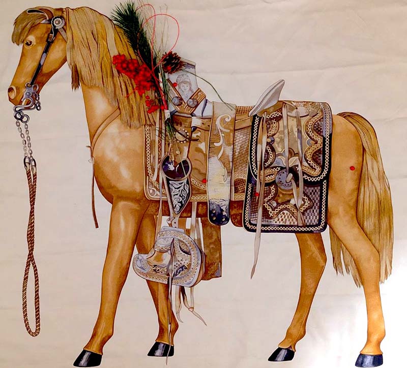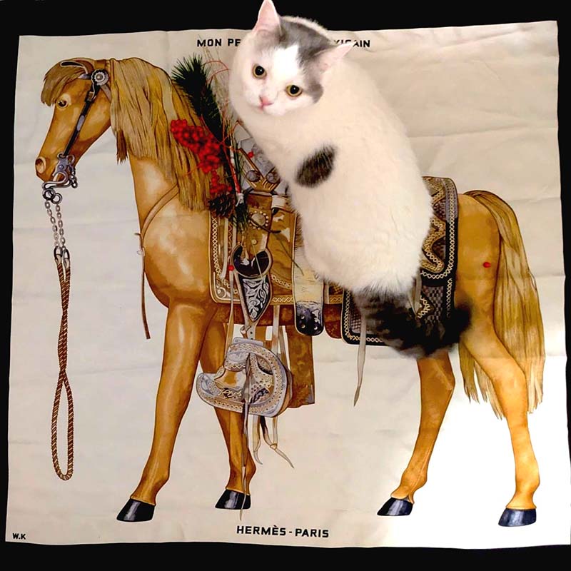 馬が描かれた大判のスカーフに乗っかっているわけです。