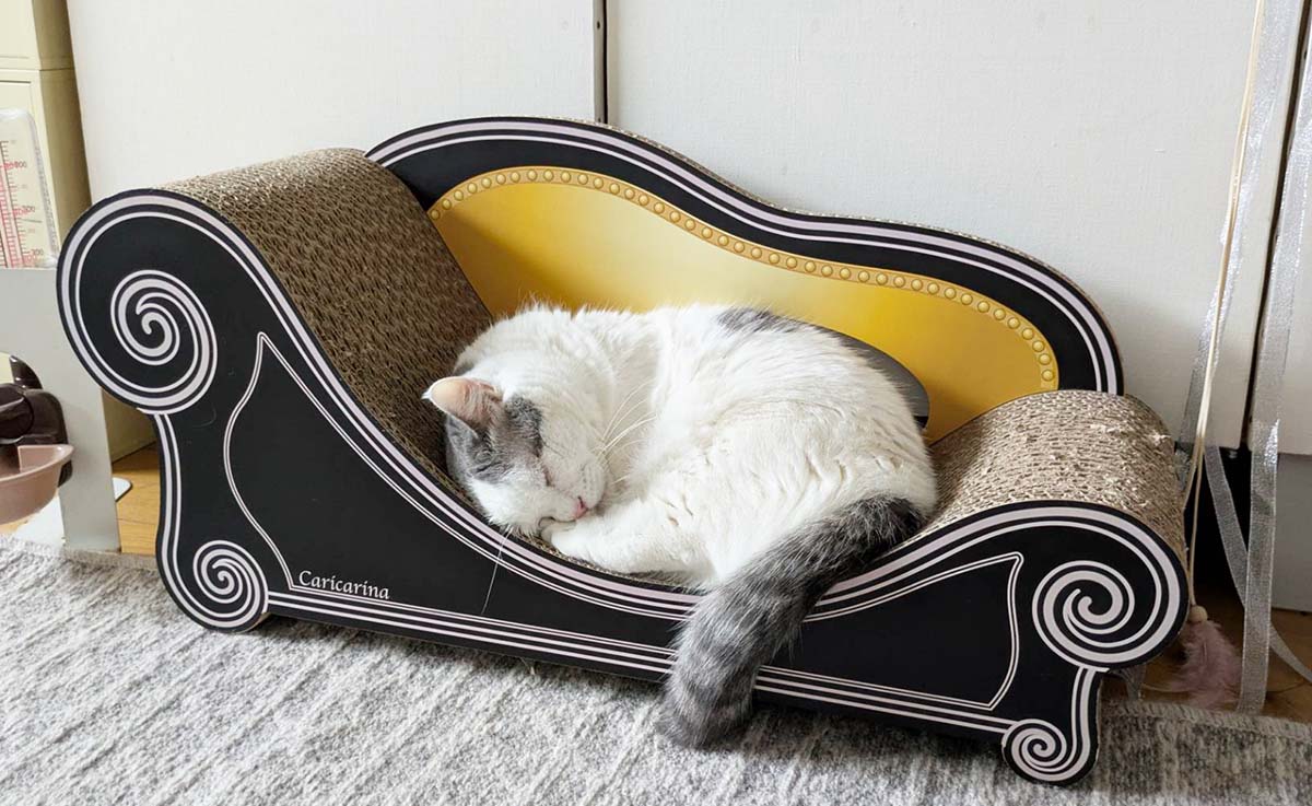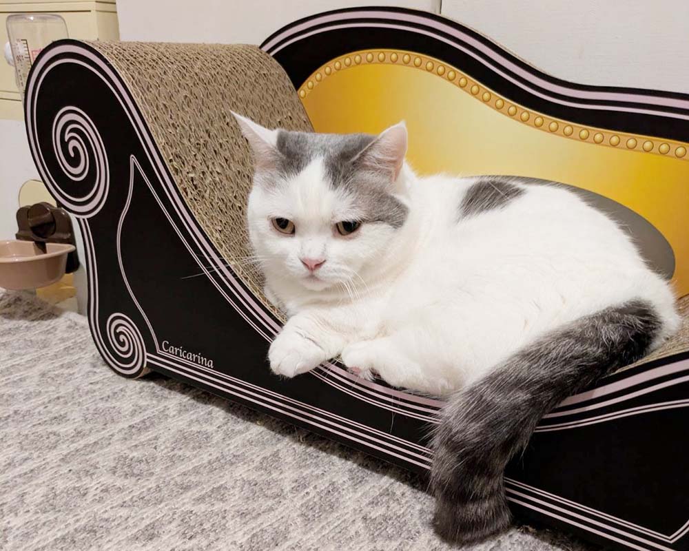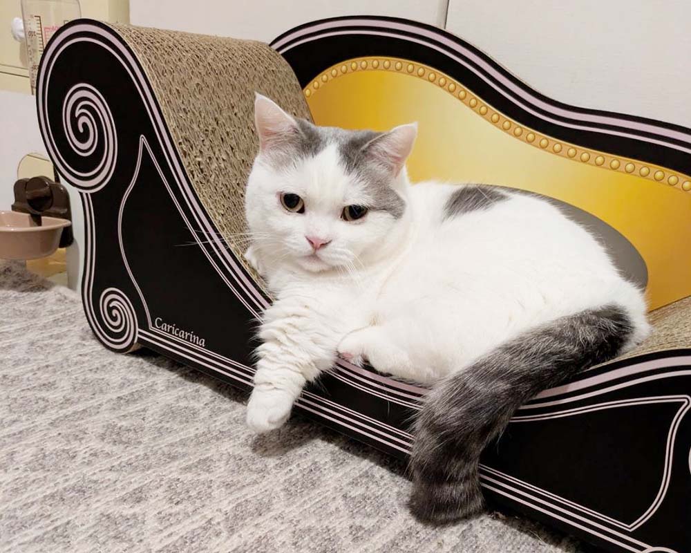 寝起きでご機嫌斜め。ちょっと前足を出しています