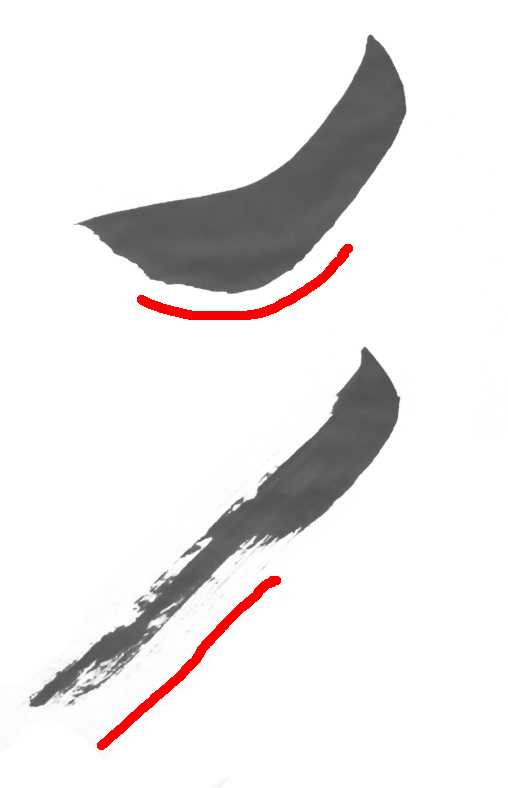 左に行くにしたがって筆が倒れると、筆毛の中央(筆の腹)が出てきてのっぺりとした線に。
